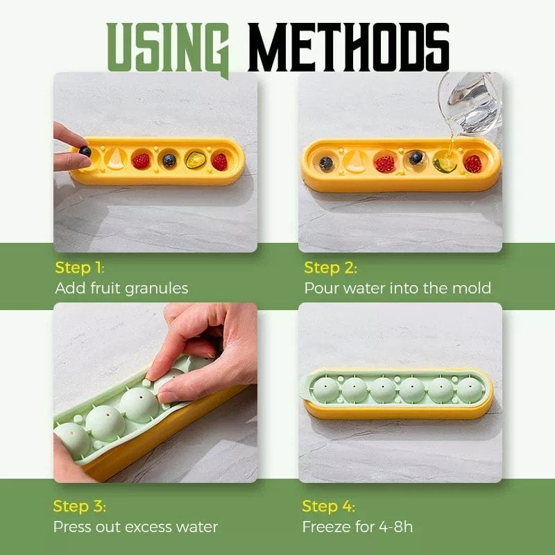❄Using Methods Step 1: Add fruit granules; Step 2: Pour water into the mold; Step 3: Press out excess water; Step 4: Freeze for 4-8h.